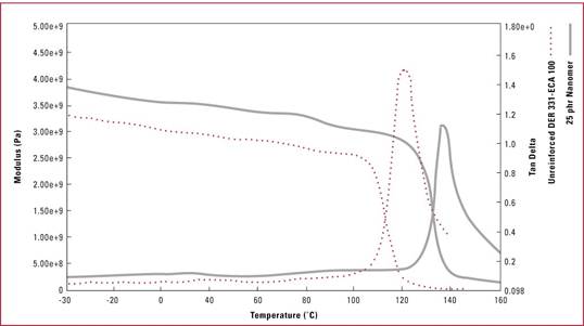 Epoxy nanocomposites exhibit improved mechanical properties due to reinforcing effects. Generally, the magnitude of improvement is larger in the region above the Tg. Figure 1 presents the DMA for neat epoxy and the corresponding nanocomposite at 25 phr loading.